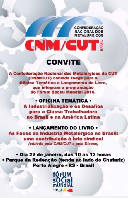 20 enero, 2016La afiliada de IndustriALL Global Union en Brasil, CNM/CUT, abordará los cambios de la industria con un taller temático y la presentación de un libro el 22 de enero de 10:00 a 13:00hs en Porto Alegre, Brasil