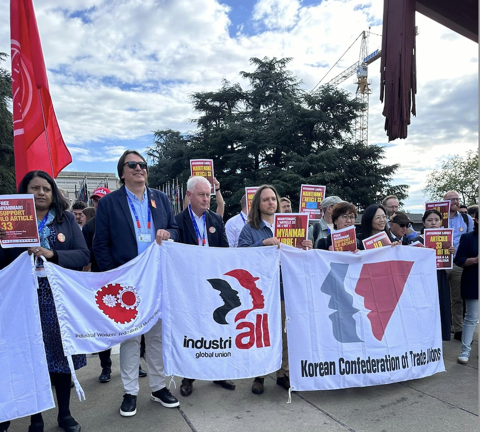 11 juin, 2024Hier, des fédérations syndicales internationales (FSI), des militants syndicaux et des délégués participant à la 112e Conférence internationale du travail (CIT), à Genève, se sont réunis près de la sculpture Broken Chair pour demander à l’Organisation internationale du travail (OIT) d’invoquer l’article 33 de sa constitution, car la junte militaire qui dirige le Myanmar depuis plus de trois ans n’a pas mis en œuvre les recommandations formulées après qu’une commission d’enquête de l’OIT a constaté de graves violations des protocoles relatifs au travail forcé et à la liberté d’association.