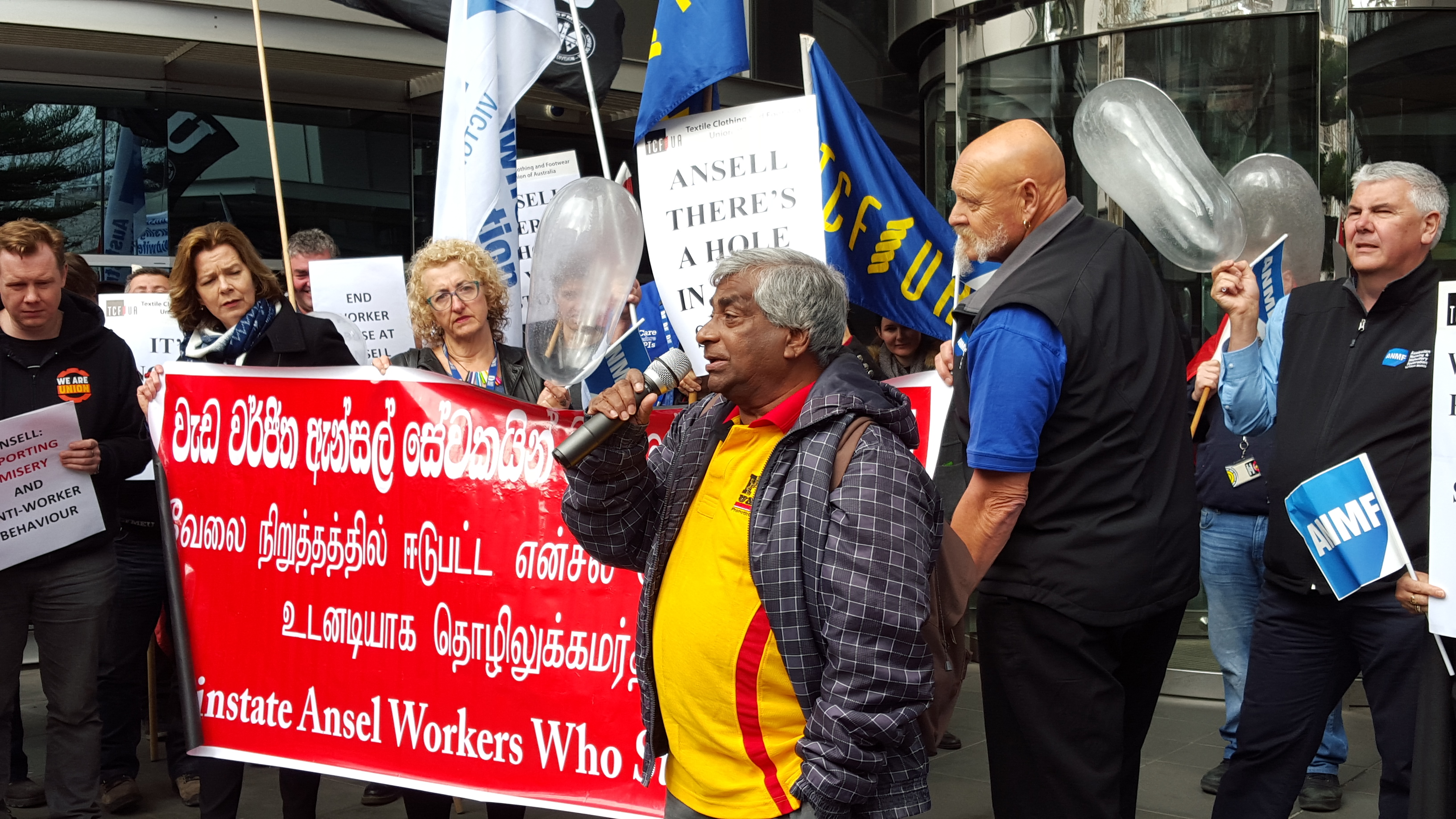 25 августа, 2015Члены профсоюзов работников текстильной, обрабатывающей и строительной промышленности Австралии посетили сегодня штаб-квартиру производителя презервативов и резиновых перчаток Ansell в Мельбурне, чтобы потребовать лучшего отношения к работникам в Шри-Ланке.