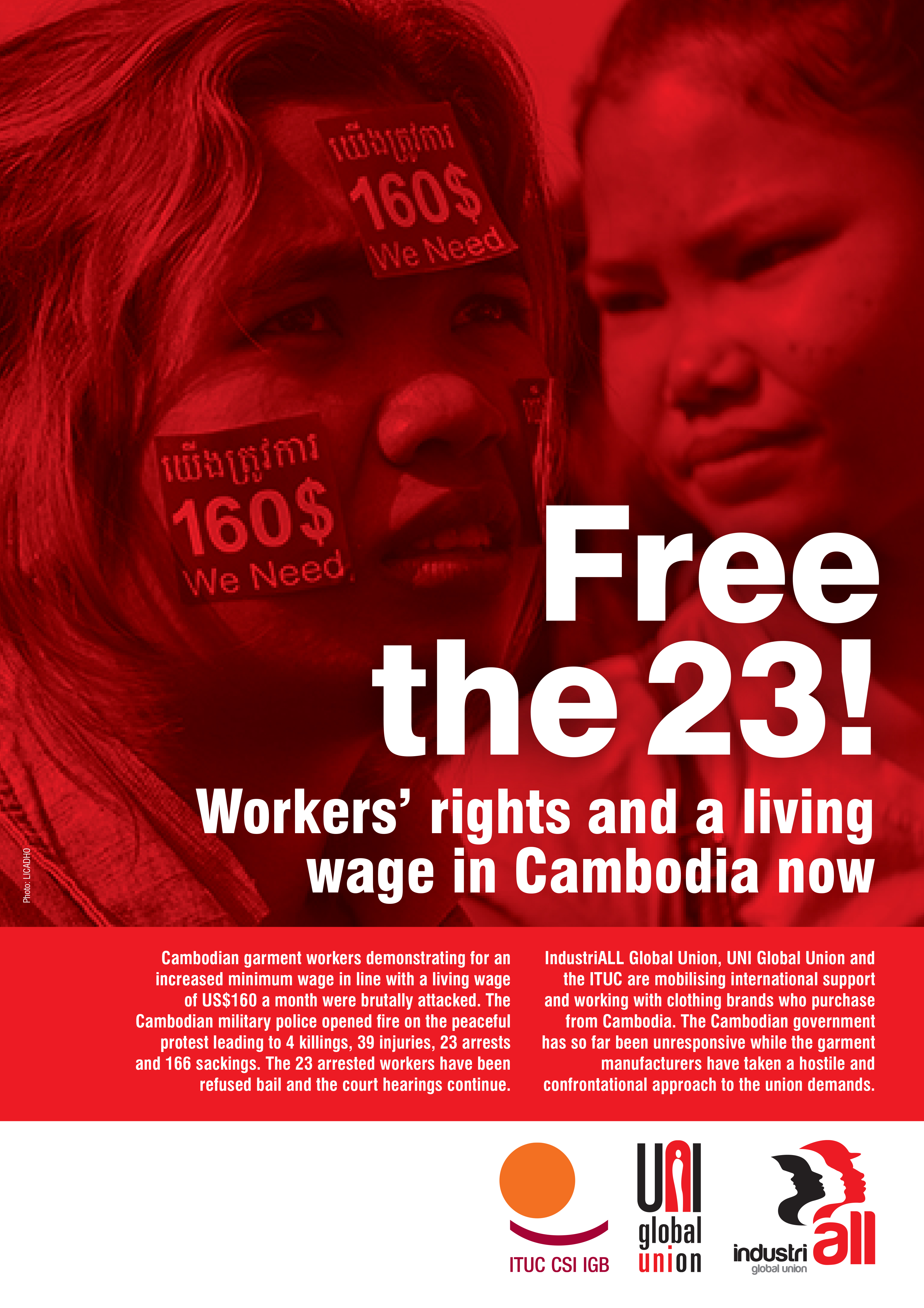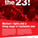 Глобальный Союз IndustriALL, Глобальный Союз UNI и МКП заручаются международной поддержкой в знак солидарности с активистами, арестованными во время состоявшихся в прошлом месяце демонстраций, участники которых требовали повышения заработной платы работников швейной промышленности. Призыв к действиям “Свободу 23-м” прозвучал накануне назначенного на 11 февраля судебного заседания по делу арестованных рабочих.