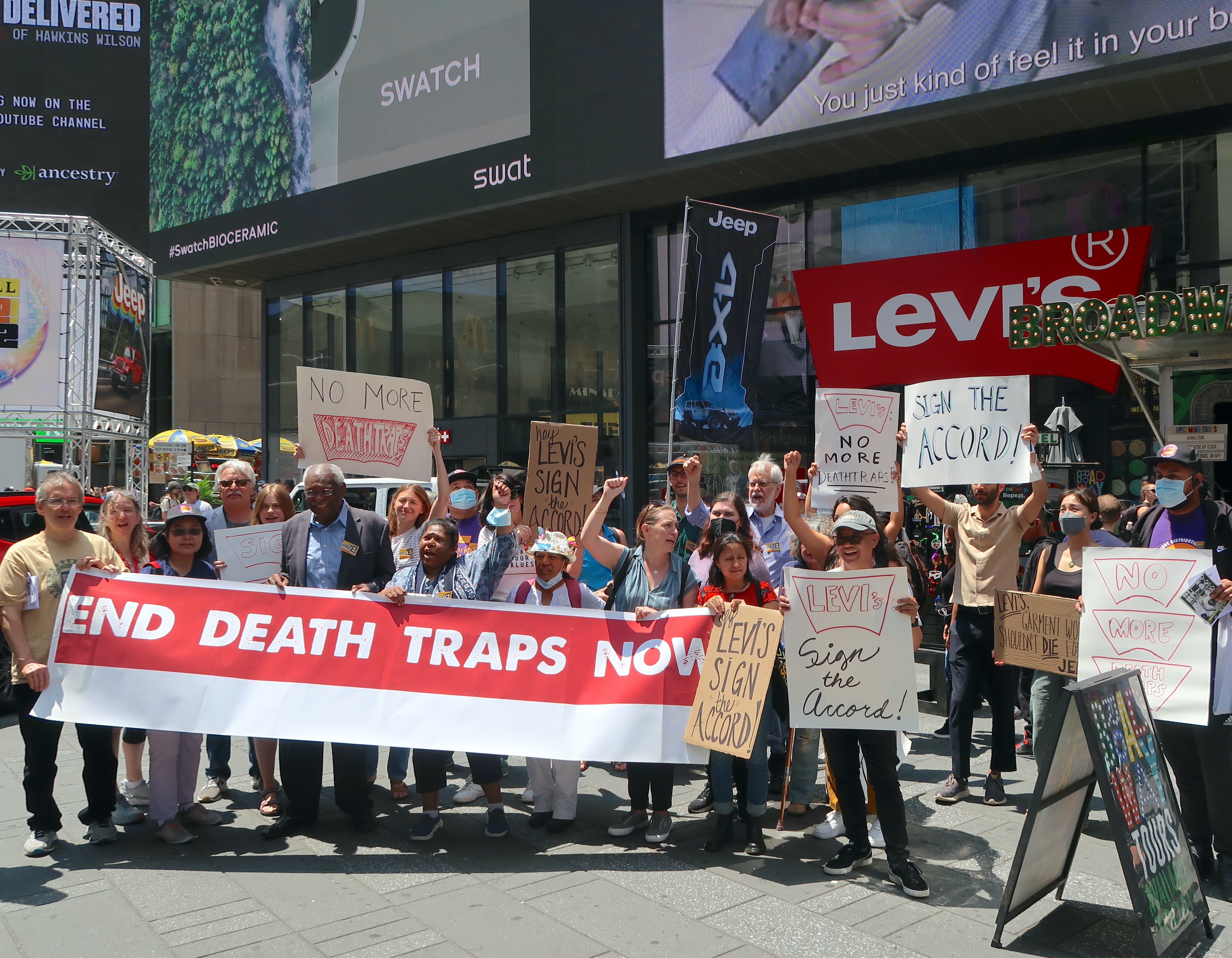 30 июня, 2022На прошлой неделе представители членских организаций IndustriALL – Бангладешской федерации швейников и промышленных рабочих и американского профсоюза Workers United – вместе с активистами Союза студентов против потогонной системы, организации Model Alliance, объединения Remember the Triangle Fire Coalition (коалиции, созданной в память о жертвах пожара на фабрике Triangle в 1911 году) и ассоциации Interfaith Center on Corporate Responsibility, выступающей за корпоративную социальную ответственность, собрались у флагманского магазина Levi's на Таймс-сквер в Нью-Йорке, чтобы призвать джинсового гиганта присоединиться к Международному соглашению.