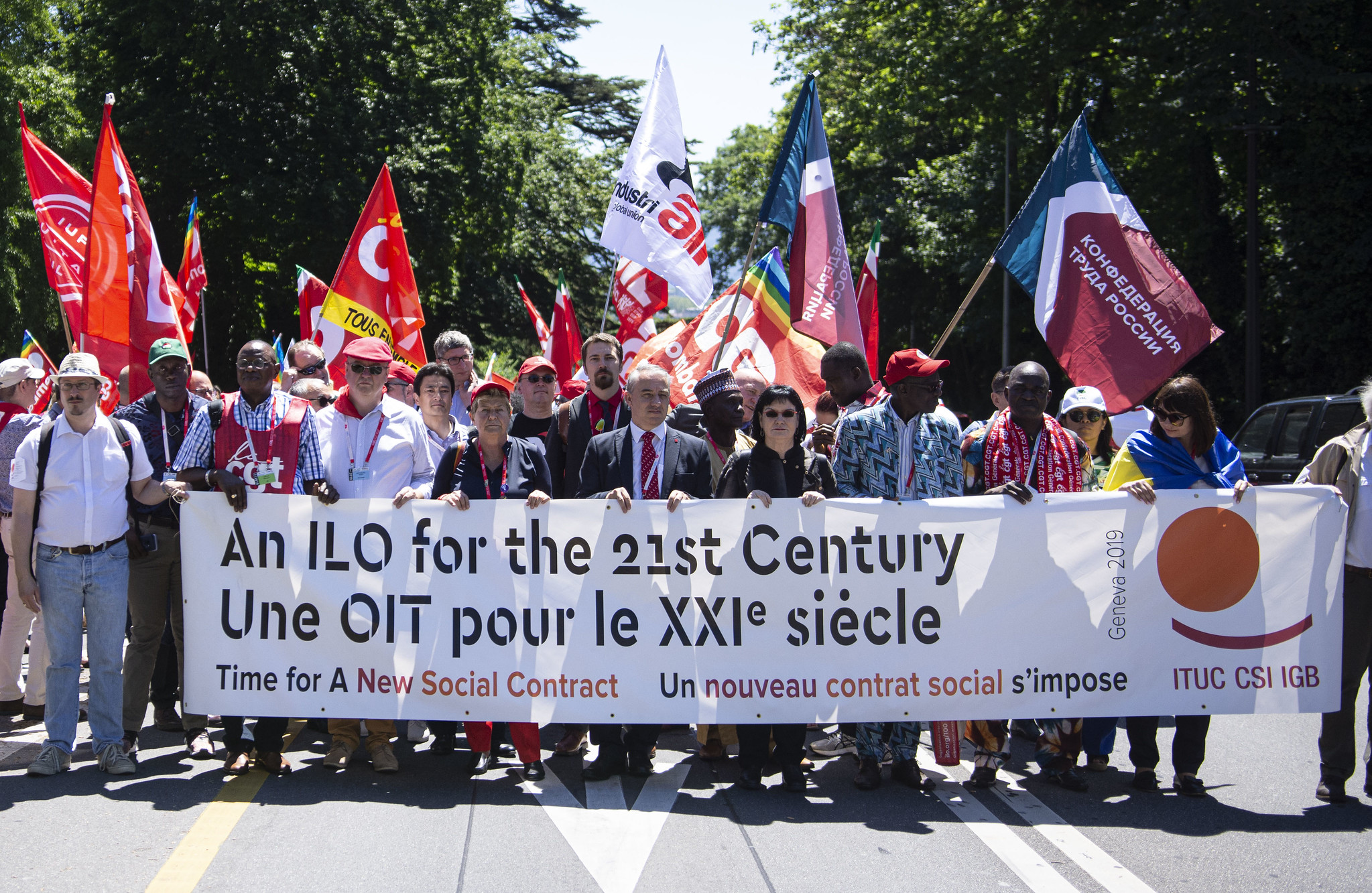 19 июня, 2019В 100-ю годовщину Международной организации труда профсоюзы из разных стран мира, принимающие участие в Международной конференции труда, прошли маршем по улицам Женевы к монументальной скульптуре Сломанный стул, установленной перед центральным входом в европейскую штаб-квартиру ООН, чтобы заявить о необходимости справедливого социального контракта в 21-м веке.
