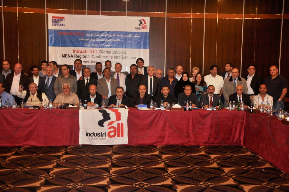 Региональная конференция Глобального cоюза IndustriALL для стран Ближнего Востока и Северной Африки состоялась 4-5 апреля 2013 года в Бейруте, Ливан. В ней приняли участие 50 делегатов из Марокко, Туниса, Египта, Палестины, Ливана, Иордании, Бахрейна, Кувейта, Йемена и Ирака, а также представители партнерских организаций из Франции, Турции и Австралии.