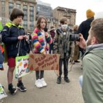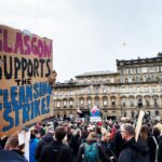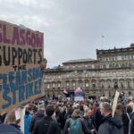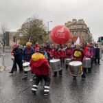 В пятницу, 5 ноября, участники школьной забастовки за климат “Пятницы ради будущего” прошли маршем по городу и собрались на площади Джордж-сквер, к ним присоединилась профсоюзная делегация и бастующие уборщики мусора, члены профсоюза GMB, входящего в IndustriALL.