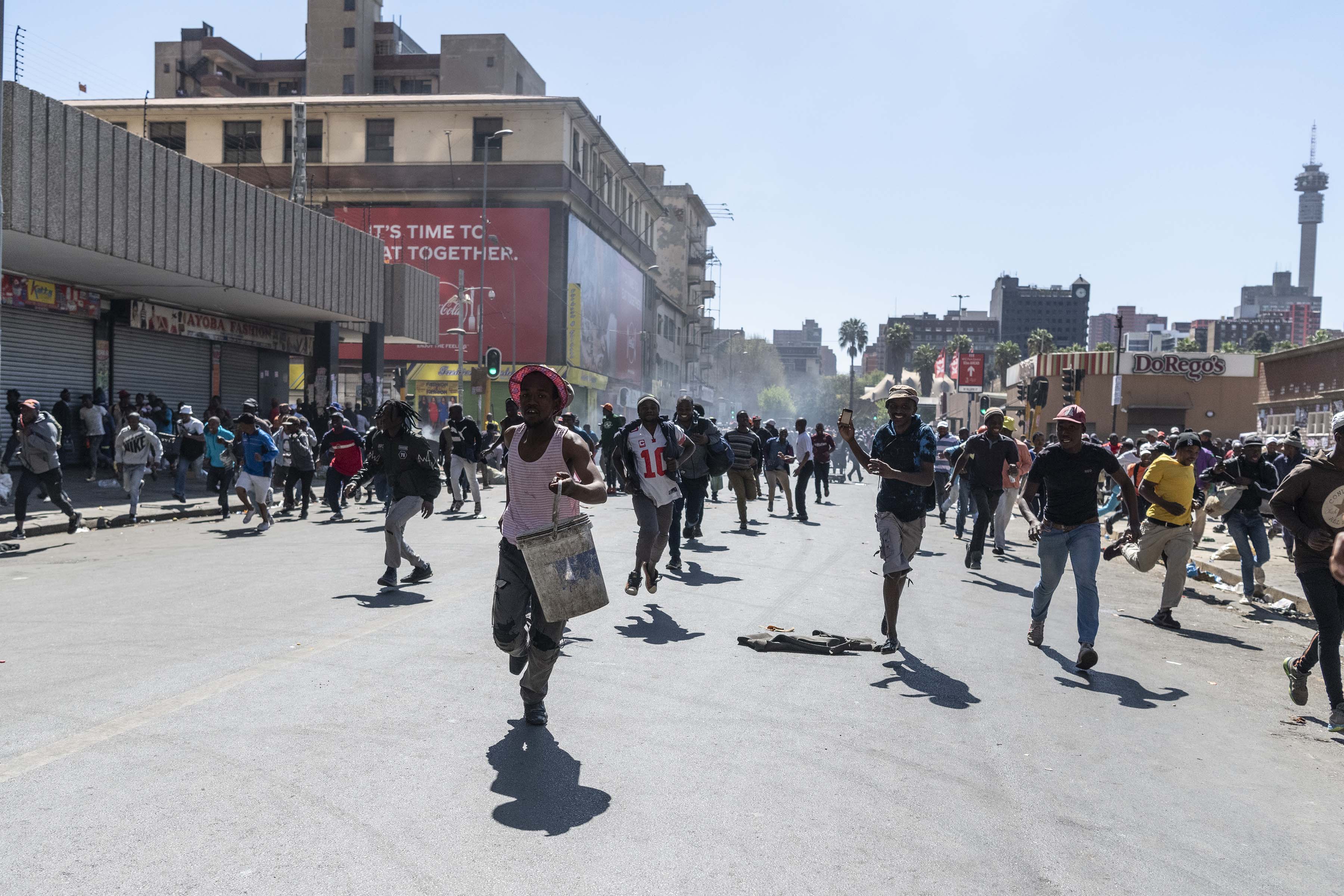 Фото: © Ихсан Хаффеджи, 2 сентября – Люди убегают от полиции, которая препятствует толпе грабить магазины, принадлежащие мигрантам
