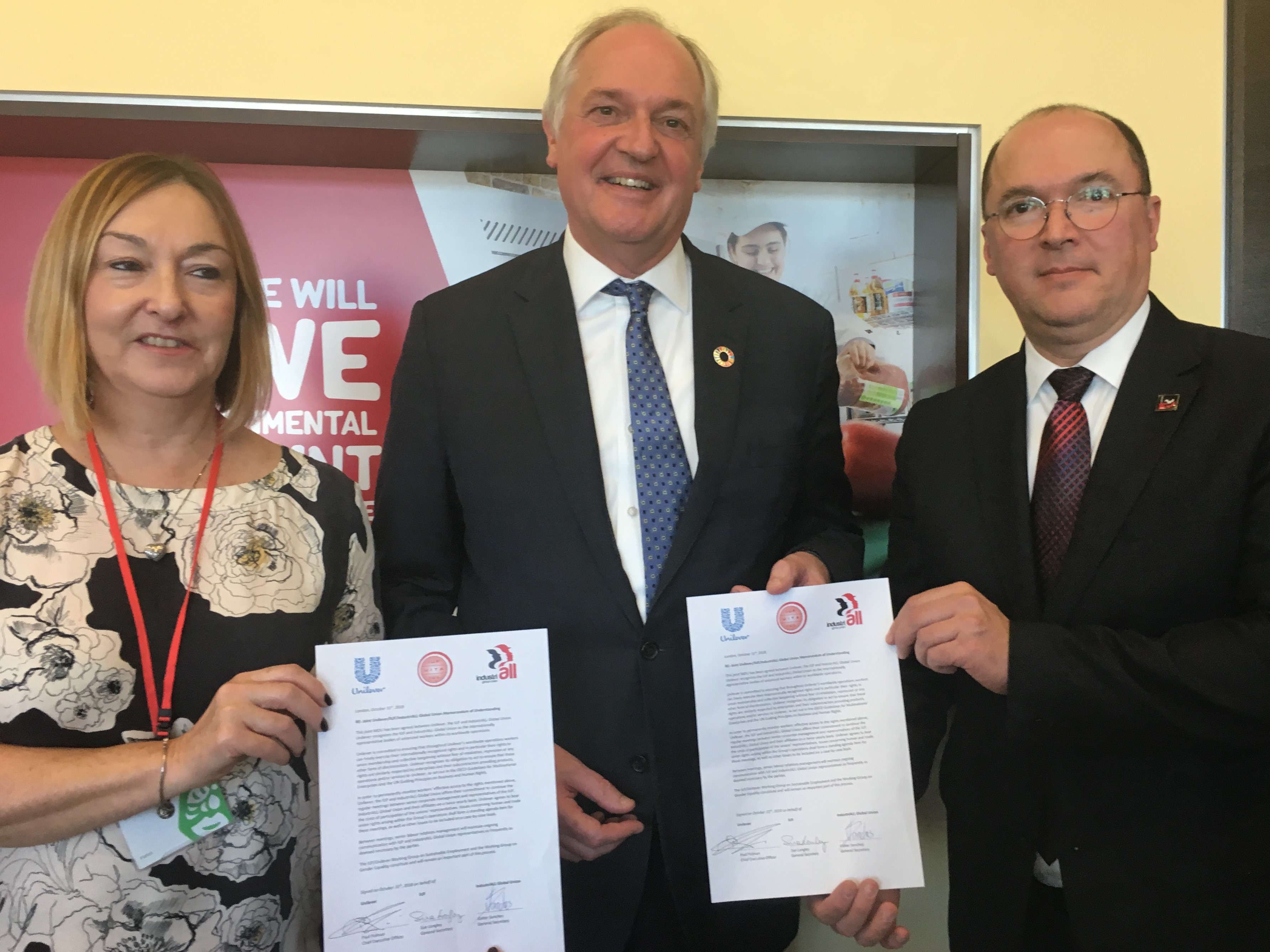 Меморандум подписали генеральный исполнительный директор Unilever Пол Польман, генеральный секретарь Глобального союза IndustriALL Вальтер Санчес и генеральный секретарь IUF Сью Лонгли. Церемония подписания состоялась 31 октября 2018 года в Лондоне.