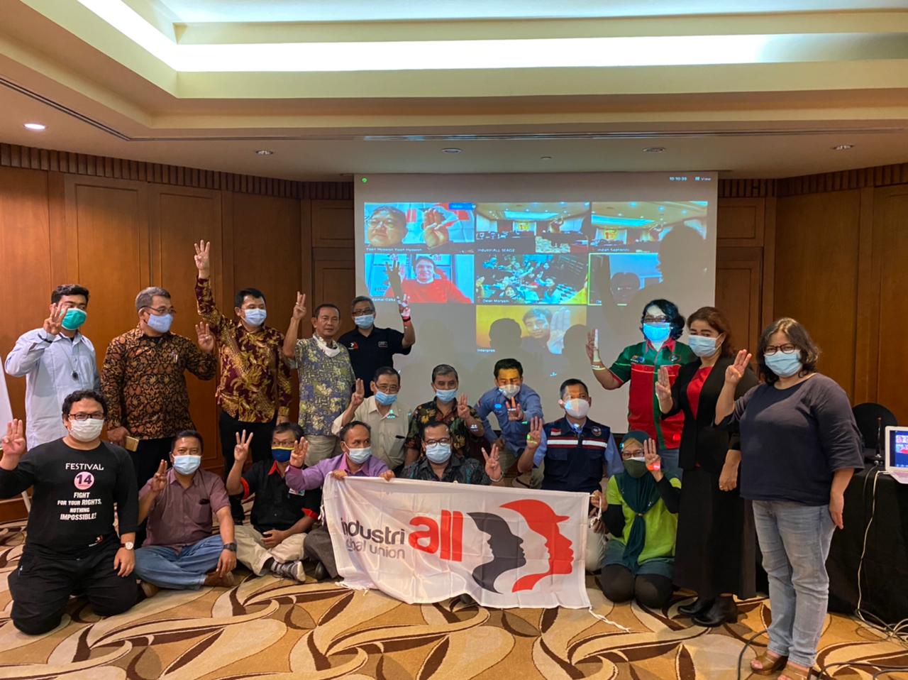 Photo 1: Indonesian union leaders and IndustriALL assistant general secretary Kemal Ozkan at the unity meeting on 25 Feb raising three fingers in support of workers involved in anti-coup protests in Myanmar.