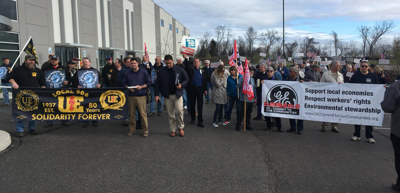 3 May, 2018General Electric workers on both sides of the Atlantic took action against the multinational conglomerate on 25 April, as the company prepares to slash thousands of jobs.